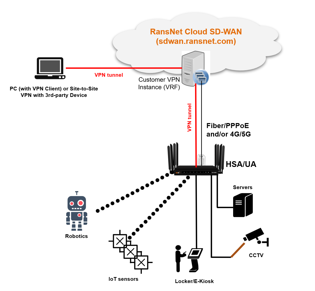 Each branch deploys a RansNet router (HSA-520, UA-520, UA-800, or XE-300 series) and connects to the internet — over fibre, 4G, or 5G; static or dynamic IP. Every branch router establishes an encrypted VPN tunnel outbound to the RansNet cloud gateway. No inbound port-forwarding or static IP is required at the branch.