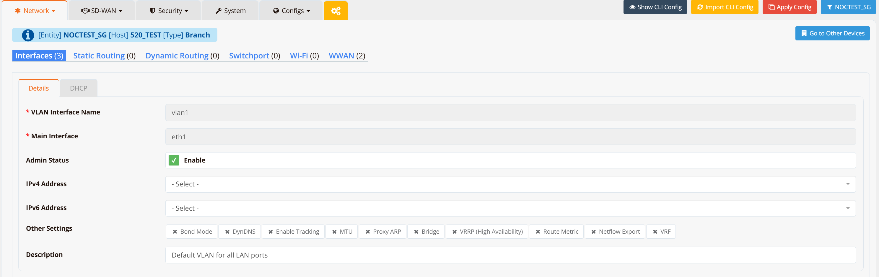 Navigate to Device → Interfaces → VLAN and create VLAN 1 without assigning an IP address.