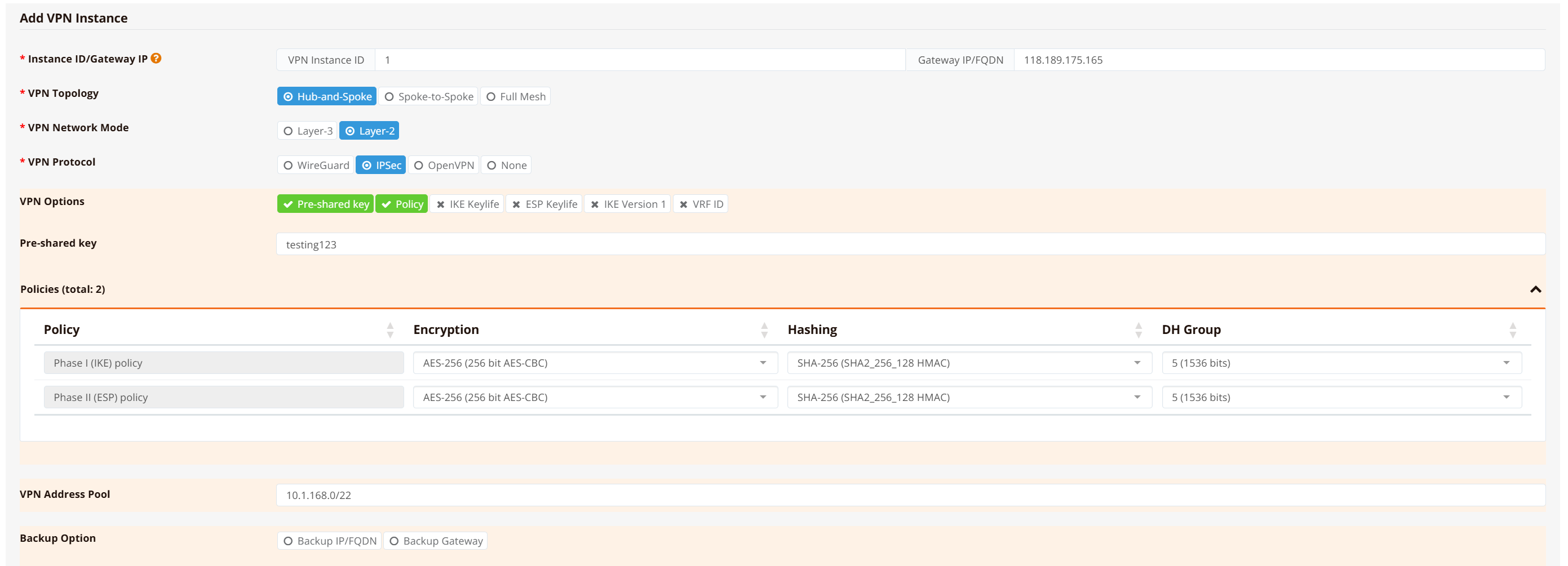 Select Hub-and-Spoke topology, Layer-2* network mode, and IPSec** as the encryption protocol.
