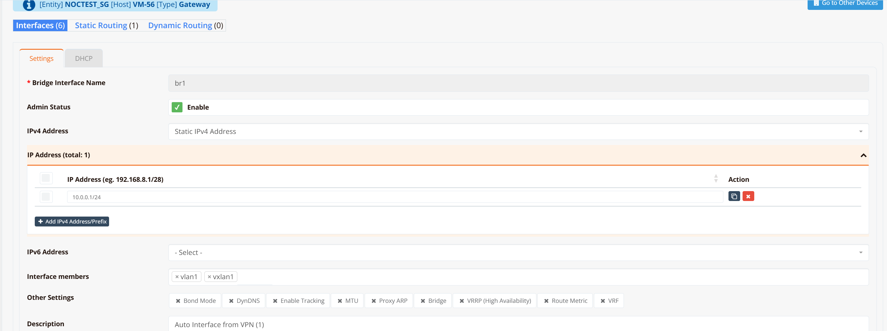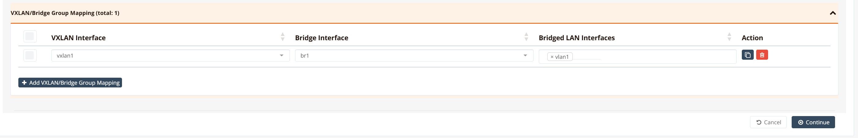 After the configuration is pushed, a br1 bridge and vxlan1 tunnel interface are automatically created on the gateway. If you need to bridge additional LAN/VLAN interfaces into the same tunnel, add them in the Bridged LAN Interfaces section.