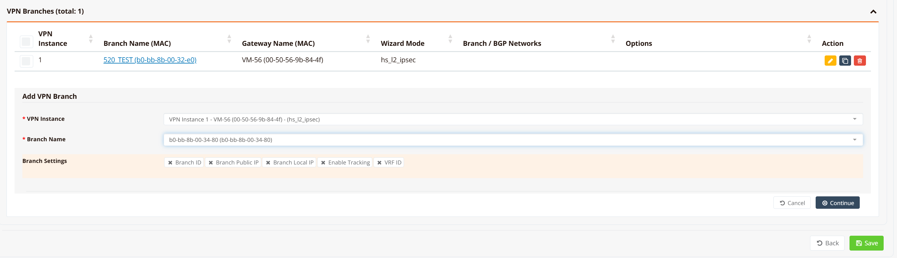 Scroll down in the VPN instance configuration, go to VPN Branches → Add VPN Branch, and select the branch routers to include. Repeat for all branch routers.