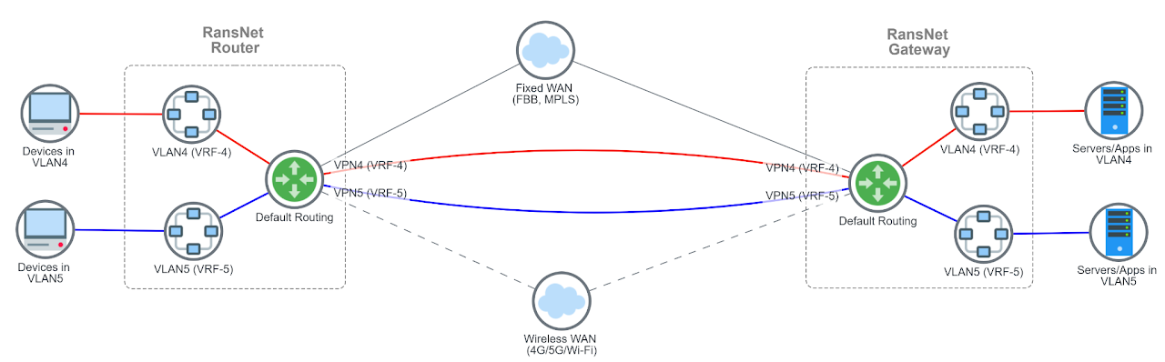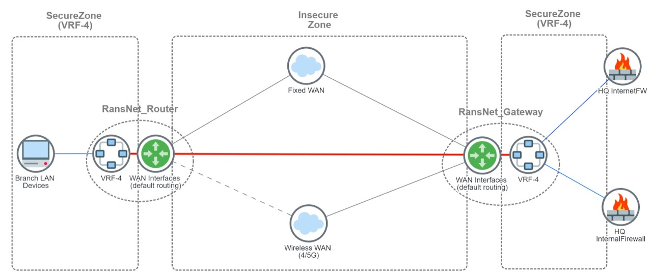In certain SD-WAN deployments, branch networks are required to backhaul all traffic to a centralised firewall located at the headquarters or data centre for centralised security inspection and policy enforcement. RansNet routers support this model through VRF over SD-WAN — establishing VPN tunnels using the system default routing table (transport VRF), while running a dedicated routing domain (service VRF) over the SD-WAN overlay to carry internal LAN traffic end-to-end.