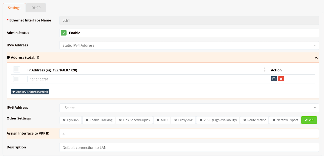 Navigate to Device → Network → Interfaces, click the LAN interface, and assign the same VRF ID as configured on the gateway.