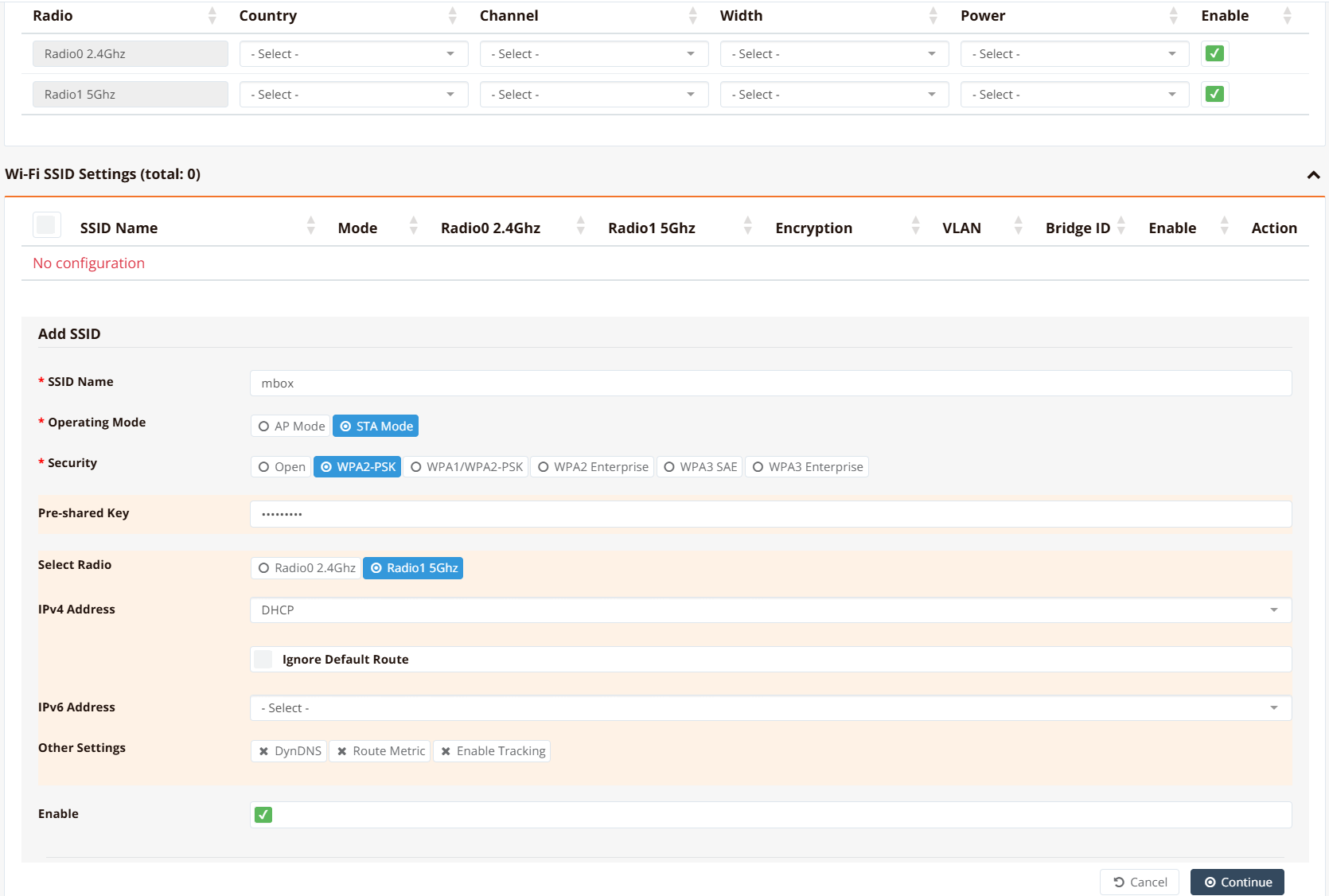 | Pre-Shared Key (PSK) | The Wi-Fi passphrase for the upstream network |