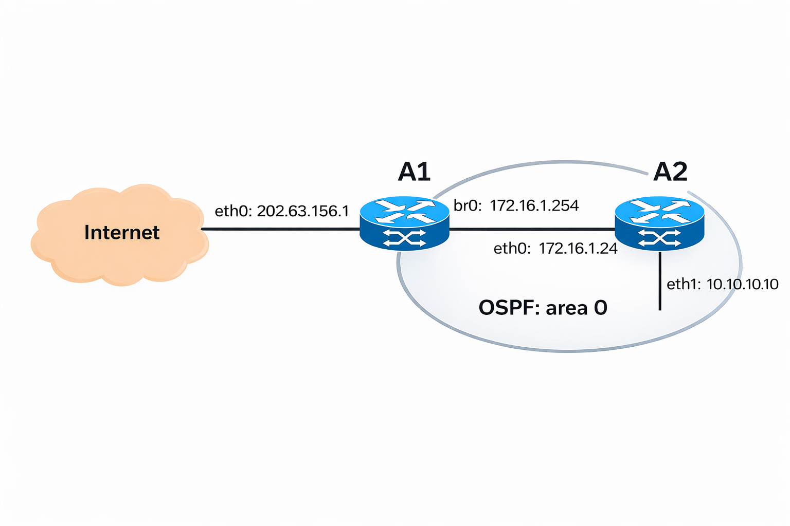 router-id 172.16.1.254— sets an explicit, stable router ID; using the internal interface IP is recommendednetwork 172.16.1.0/24 area 0— enables OSPF onbr0and advertises the prefix into area 0default-information originate— redistributes A1's default route into OSPF so downstream routers (A2) learn a default gateway automaticallypassive-interface eth0— suppresses hello packets on the WAN interface; the interface is not included in OSPF advertisements and no neighbour adjacency can form on it