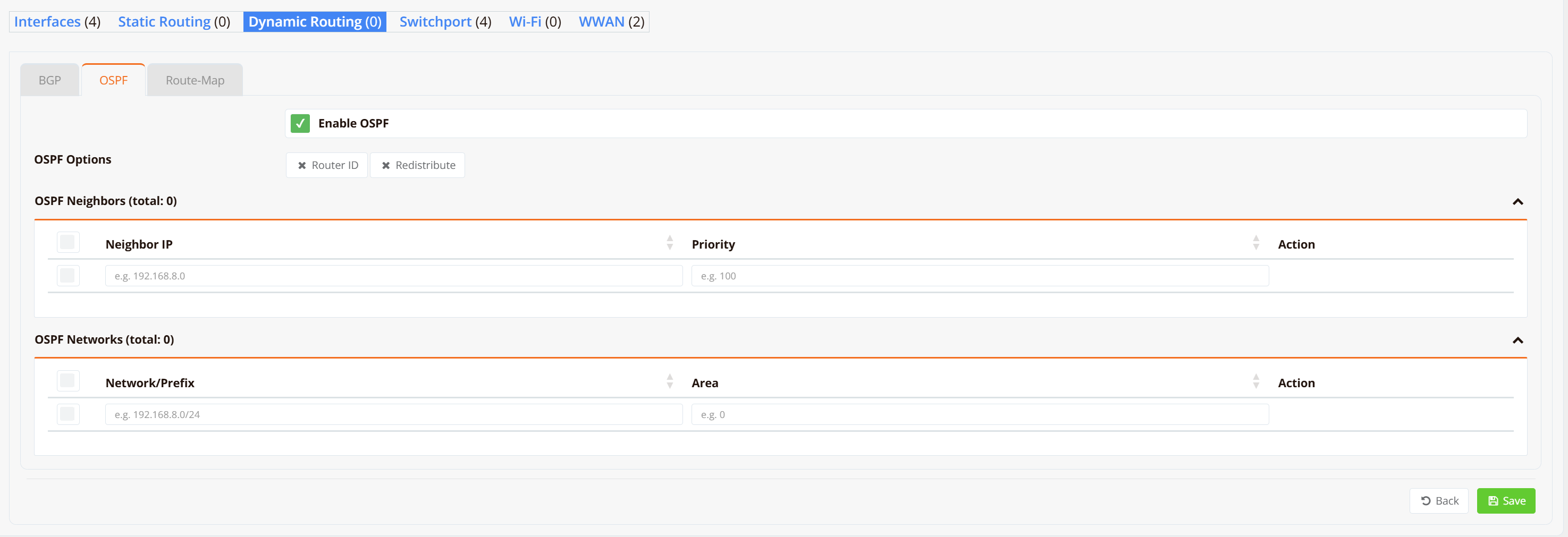Navigate to Device Settings → Network → Dynamic Routing → OSPF.