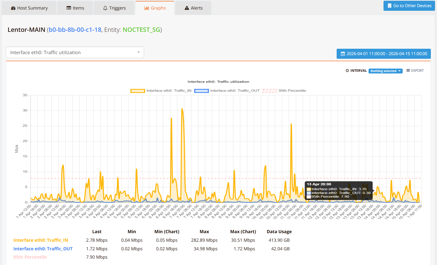 The Hosts page provides a centralised inventory of all monitored devices within the selected entity, along with their real-time status, key system information, and access to per-device drill-down analysis. It is the primary starting point for investigating a specific device — whether responding to an alert, checking firmware versions across a fleet, or reviewing a device's historical performance graphs.