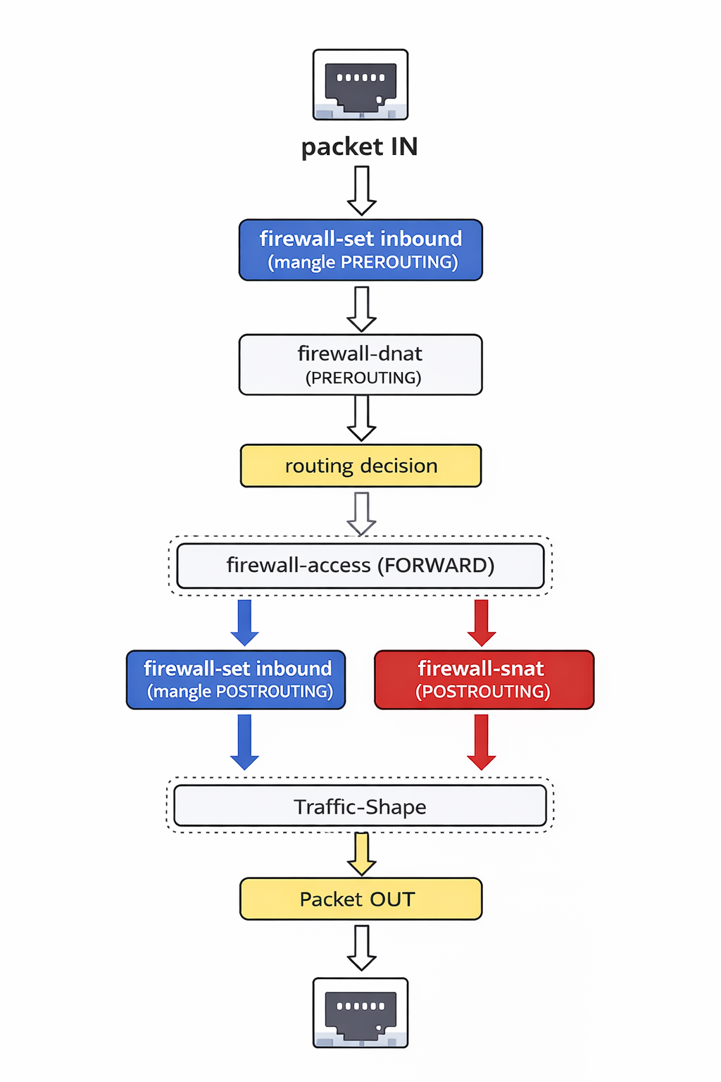 - firewall-set inbound (mangle PREROUTING) — optional packet marking for QoS classification, applied before any routing decision