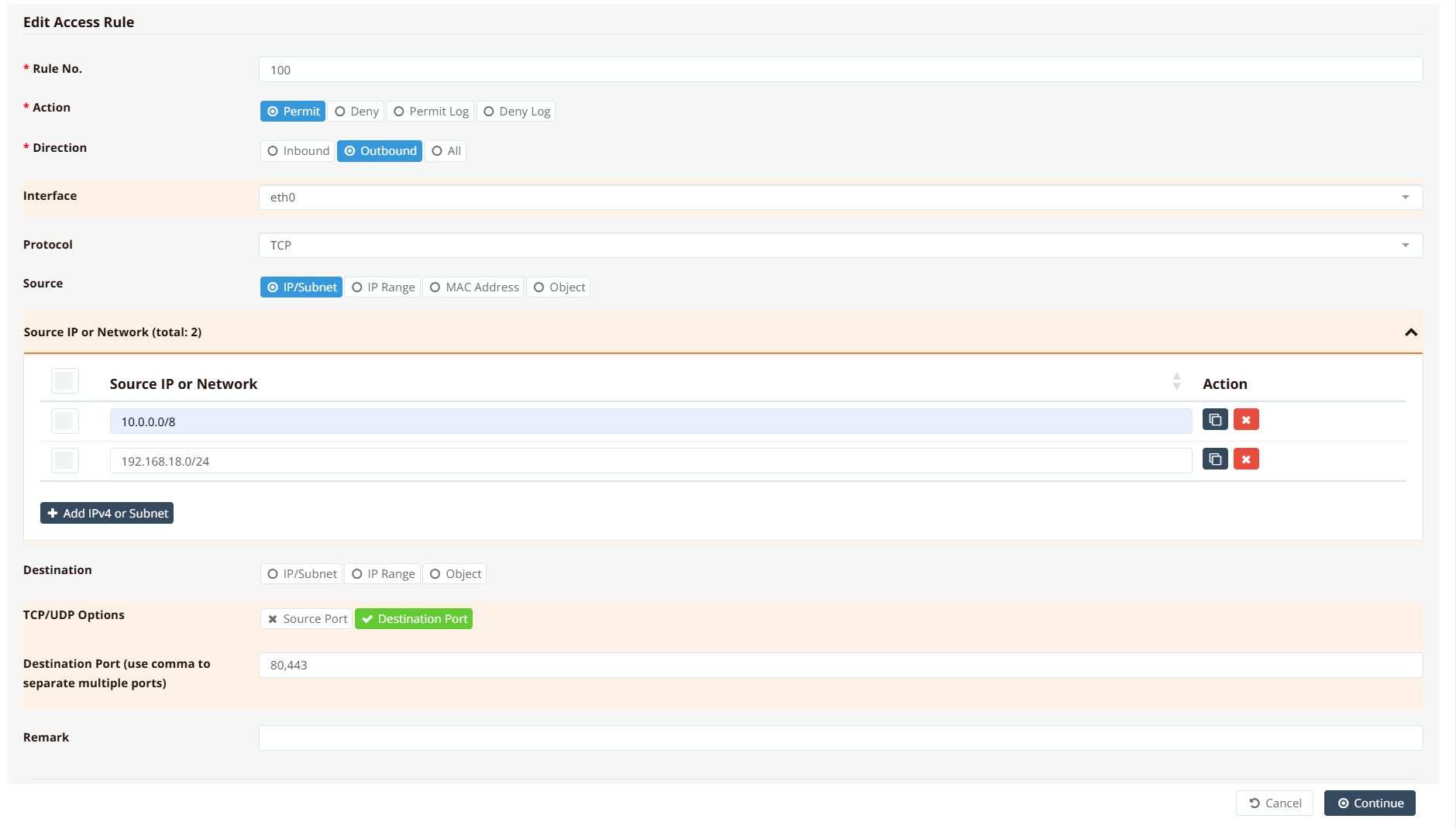 100— rule number; evaluated before any rule numbered 101 or higherpermit outbound eth0— permit traffic leaving viaeth0tcp— match TCP protocol onlysrc 10.0.0.0/8,192.168.18.0/24— match packets from either source subnet (comma-separated, no spaces)dport 80,443— match destination port 80 or 443