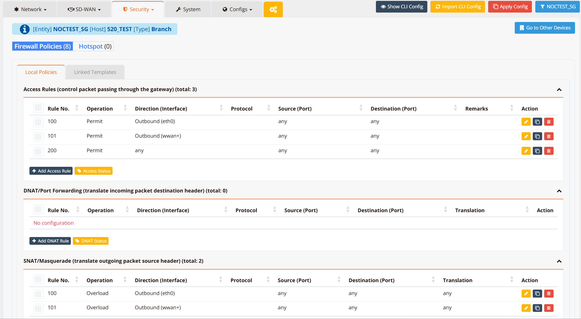 Firewall policies are the rules that control which traffic is permitted, denied, or translated as it passes through or terminates on the router. Each rule chain has a dedicated section — Access, DNAT, SNAT, and Input — and all rules within a chain are evaluated top-to-bottom by rule number.