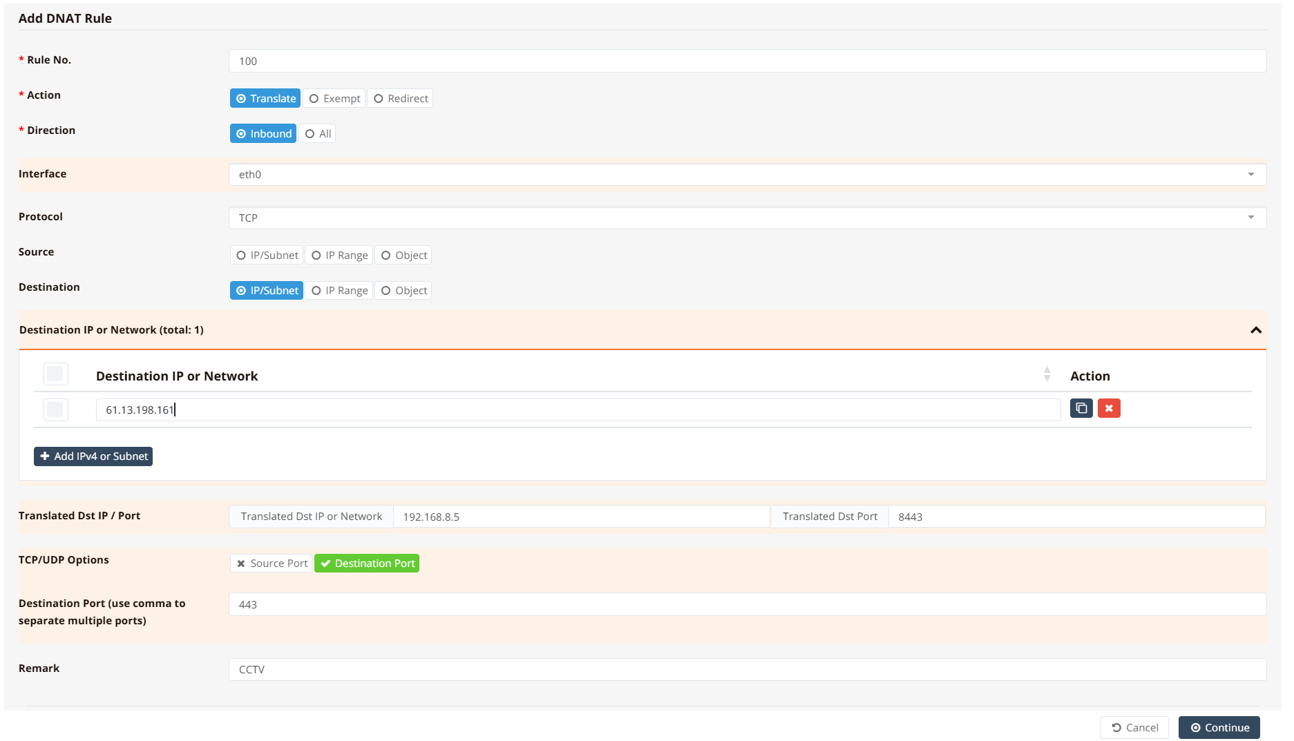 firewall-dnat 100 translate inbound eth0 tcp dst 61.13.198.161 dport 443 xdst 192.168.8.5 xdport 8443 remark CCTV