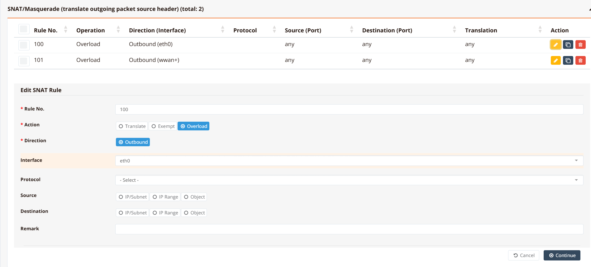 | Interface | The WAN interface on which source translation is applied (e.g. eth0, wwan0). |