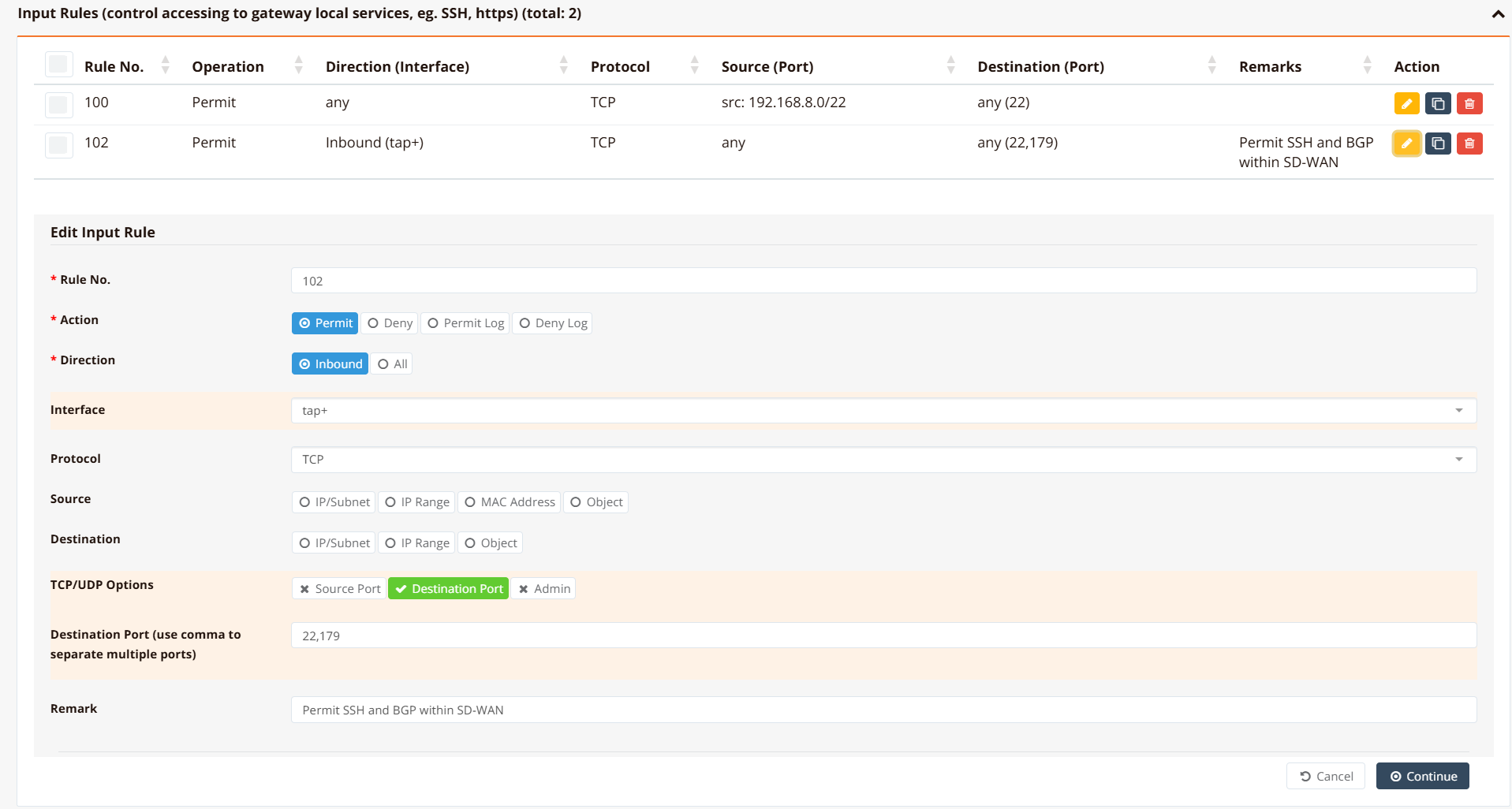 permit inbound tap+— permit traffic arriving on any SD-WAN tunnel interface (tap0,tap1, etc.)tcp dport 22,179— match TCP destination port 22 (SSH) or 179 (BGP)remark— labels the rule for identification in the policy list