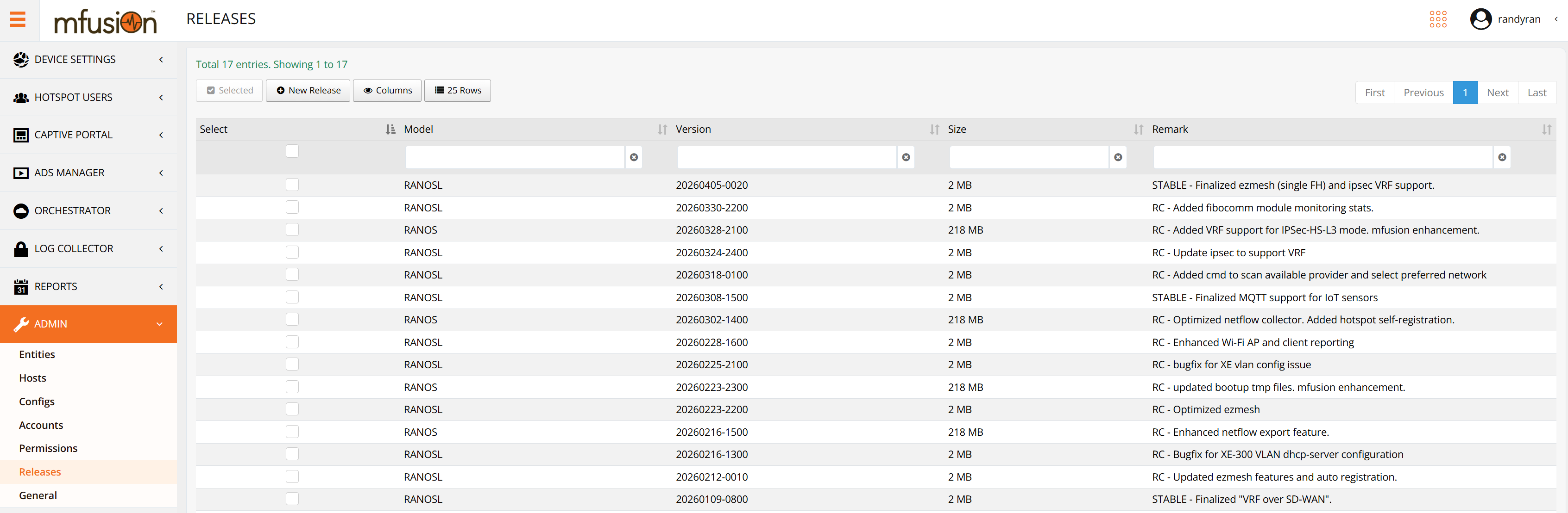 mfusion acts as an on-premise firmware repository, allowing managed devices to perform over-the-air upgrades by downloading firmware directly from the mfusion server — without requiring each device to reach the internet. Only super-administrators can upload firmware packages to this repository; firmware files are provided by the RansNet support team.