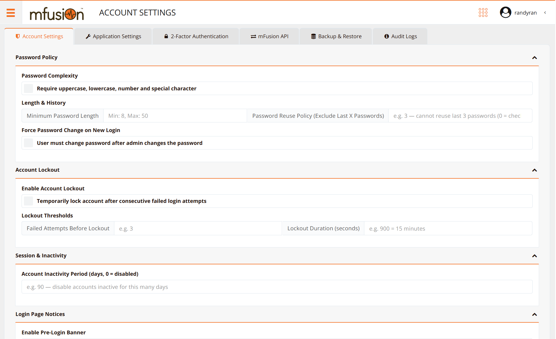 Account Security controls the login and password policies enforced across all user accounts on this mfusion instance. Settings here apply globally — configure them according to your organisation's security policy before onboarding users.